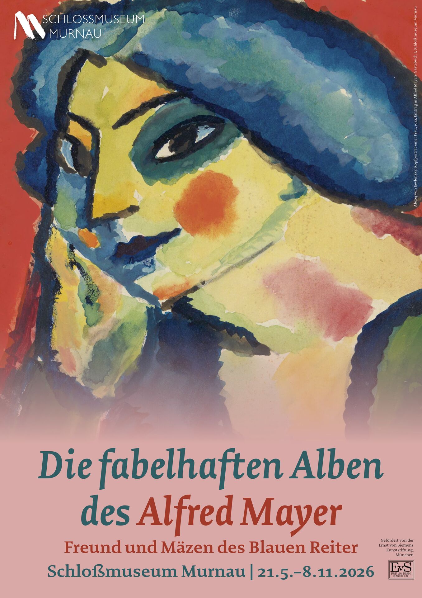 Die Ausstellung „Die fabelhaften Alben des Alfred Mayer. Freund und Mäzen des Blauen Reiter“ im Schlossmuseum Murnau widmet sich dem bislang kaum bekannten Theaterkritiker, Kunstschriftsteller, Sammler und Förderer Alfred Mayer (1860–1932). Ausgangspunkt sind drei außergewöhnliche Künstleralben sowie ein Fotoalbum aus dem Nachlass Alfred Mayers und seiner Tochter Eva, die dem Museum 2015 und 2024 als Schenkungen aus Privatbesitz übergeben wurden.