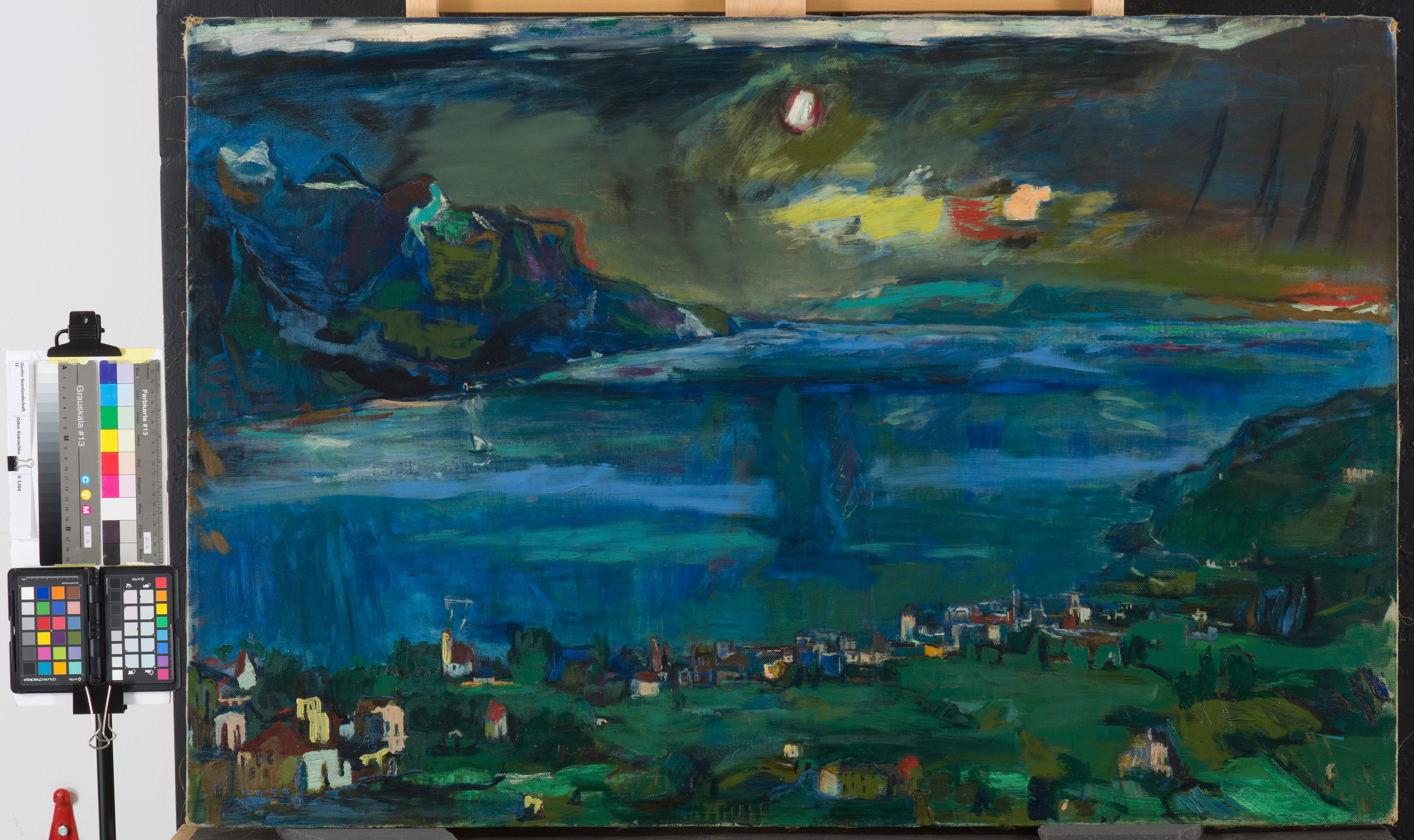 Im September 1923 hatte Kokoschka seine Lehrtätigkeit an der Dresdner Akademie unterbrochen. Der bedrängenden Enge seiner dortigen Lebenssituation suchte er durch Reisen zu entfliehen. Eines seiner ersten Ziele war die ihm vertraute Landschaft am Genfer See. Da er bereits Ende Oktober auch diesen Ort wieder verließ, müssen das Leipziger Bild und zwei weiteren Ansichten des Sees – jede von einem anderen Standort aus gemalt – im Frühherbst des Jahres 1923 geschaffen worden sein.