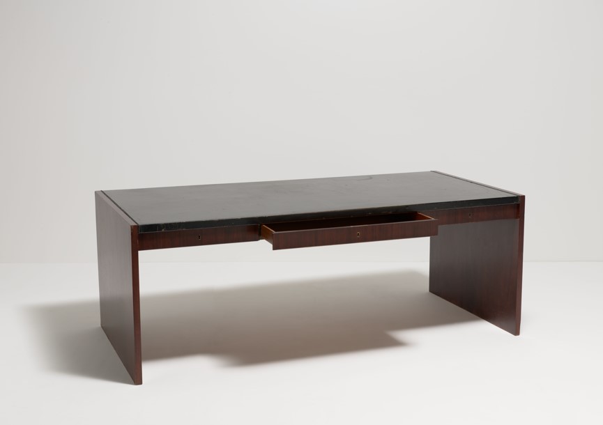Abbildung 4: Lilly Reich, Schreibtisch für das Büro der Fachgruppe 9 (Seide) in Berlin, Brückenallee, 1938, Bauhaus-Archiv Berlin, Leihgabe der Ernst von Siemens Kunststiftung © für Ludwig Mies van der Rohe: VG Bild-Kunst, Bonn 2025, Foto: Florian de Brün, Bauhaus-Archiv Berlin