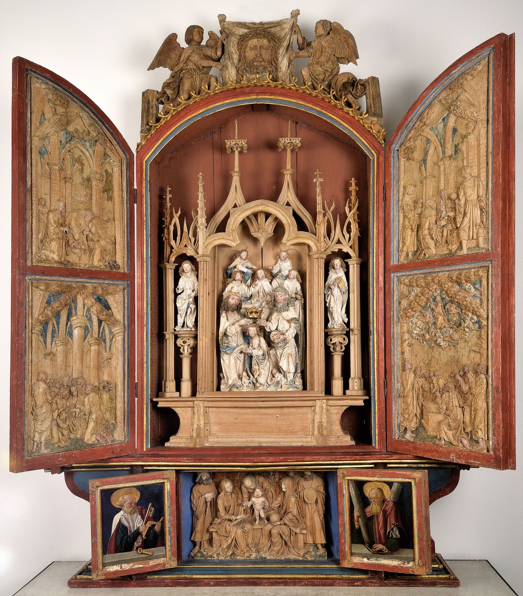 Sämtliche Darstellungen der Feiertagsseite – geöffnete Flügel – beziehen sich auf das Marienthema. Während im Predellenschrein die heilige Sippe dargestellt ist, weist der fragile Maßwerkschrein als zentrales Thema die Krönung Mariens auf. Auch die vier Reliefs der Flügel führen thematisch zur Zentralgruppe im Schrein: Geburt Christi, Anbetung der hl. Drei Könige, Marientod und Himmelfahrt Mariens. Den Abschluss bildet der Auszug mit dem von zwei Engeln gehaltenen Schweisstuch der Veronika.