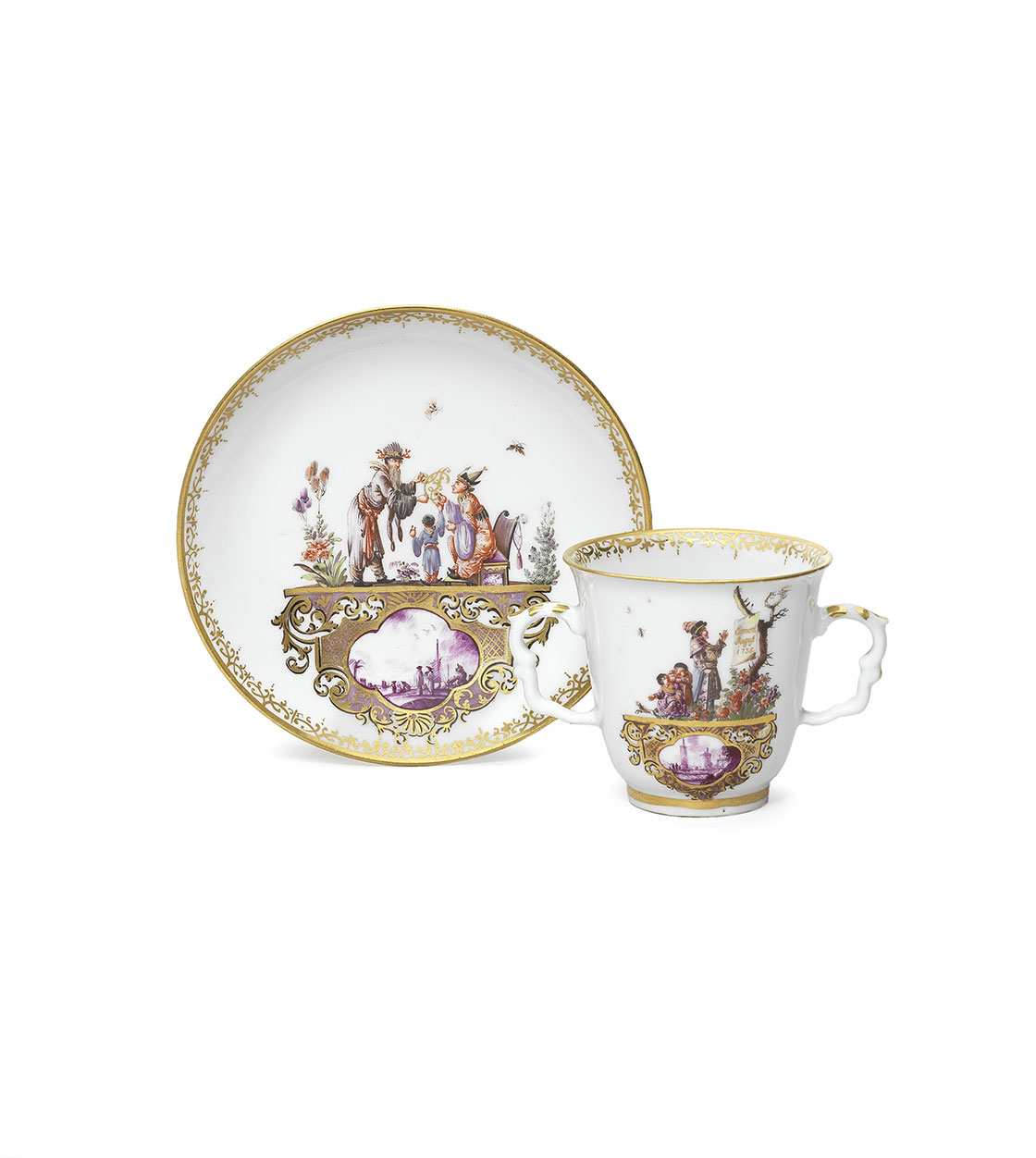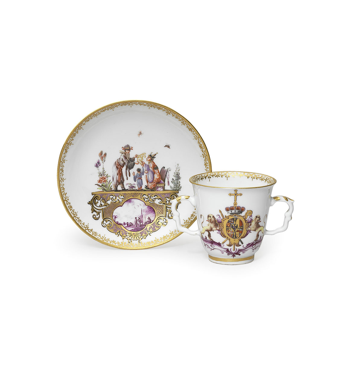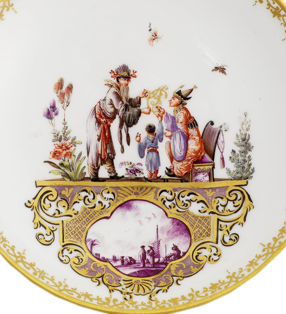 Von den 1761 gezählten 12 Schokoladentassen mit Doppelhenkel sind heute noch acht zum Teil in Sammlungen, zum Teil im Privatbesitz befindlich bekannt. Auf der Tasse, die nun mit der Unterstützung der Ernst von Siemens Kunststiftung für Schloss Augustusburg angekauft werden konnte, sind auf der Konsole drei Chinesen zu sehen, links zwei Kinder, rechts ein erwachsener Mann, der vor einem verdorrten Baum steht, an dessen Stamm ein Zettel mit der Aufschrift „Clement / August / 1735“ angeheftet ist. Auf der Konsole der Unterschale sitzt rechts ein erwachsener Chinese auf einem Stuhl, ein links stehender Mann reicht ihm die ineinander verschlungenen Initialen „CA“, während ein Kind in Rückenansicht in der Mitte steht und zusieht.