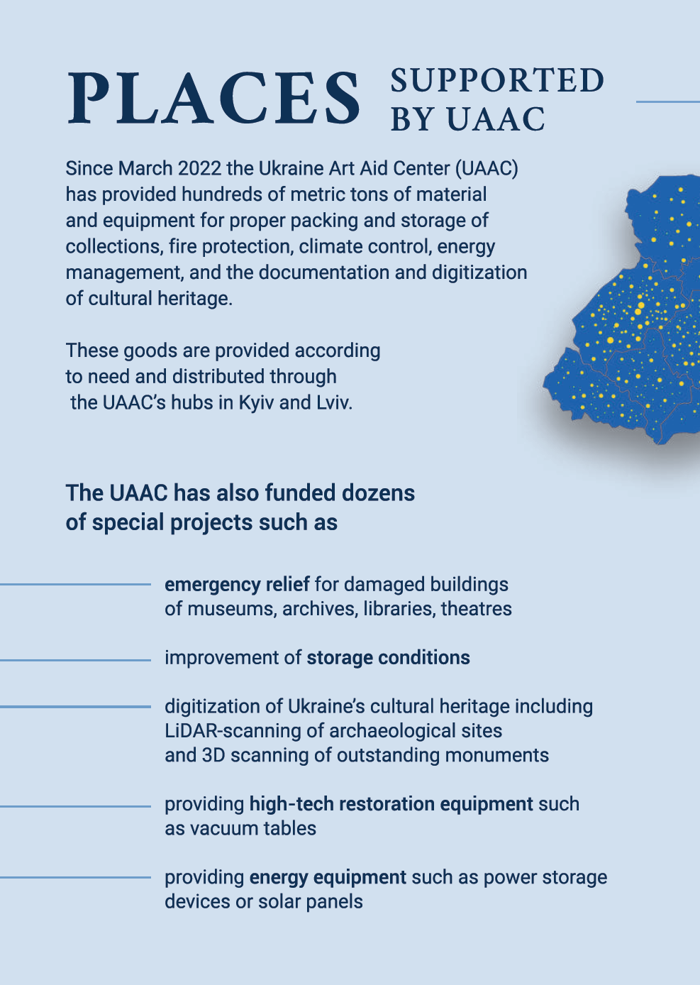 Durch die Arbeit der gemeinnützigen Organisation wird die Sicherung von Sammlungen und Gebäuden ukrainischer Kunst- und Kulturinstitutionen wie Museen, Bibliotheken und Archiven unterstützt. Notfallhilfen, Restaurierungsmaßnahmen und die Digitalisierung wichtiger Bestände können durch die Hilfe der UAAC finanziert werden.